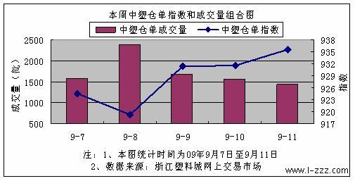截止周末15時,中塑倉單指數報收于935.62點,較上周末同比上漲9.55點。累計總成交量為8660批,同比上周末減量105批;訂貨量為4707批,較上周末增長398批。以下為各品種一周簡述: